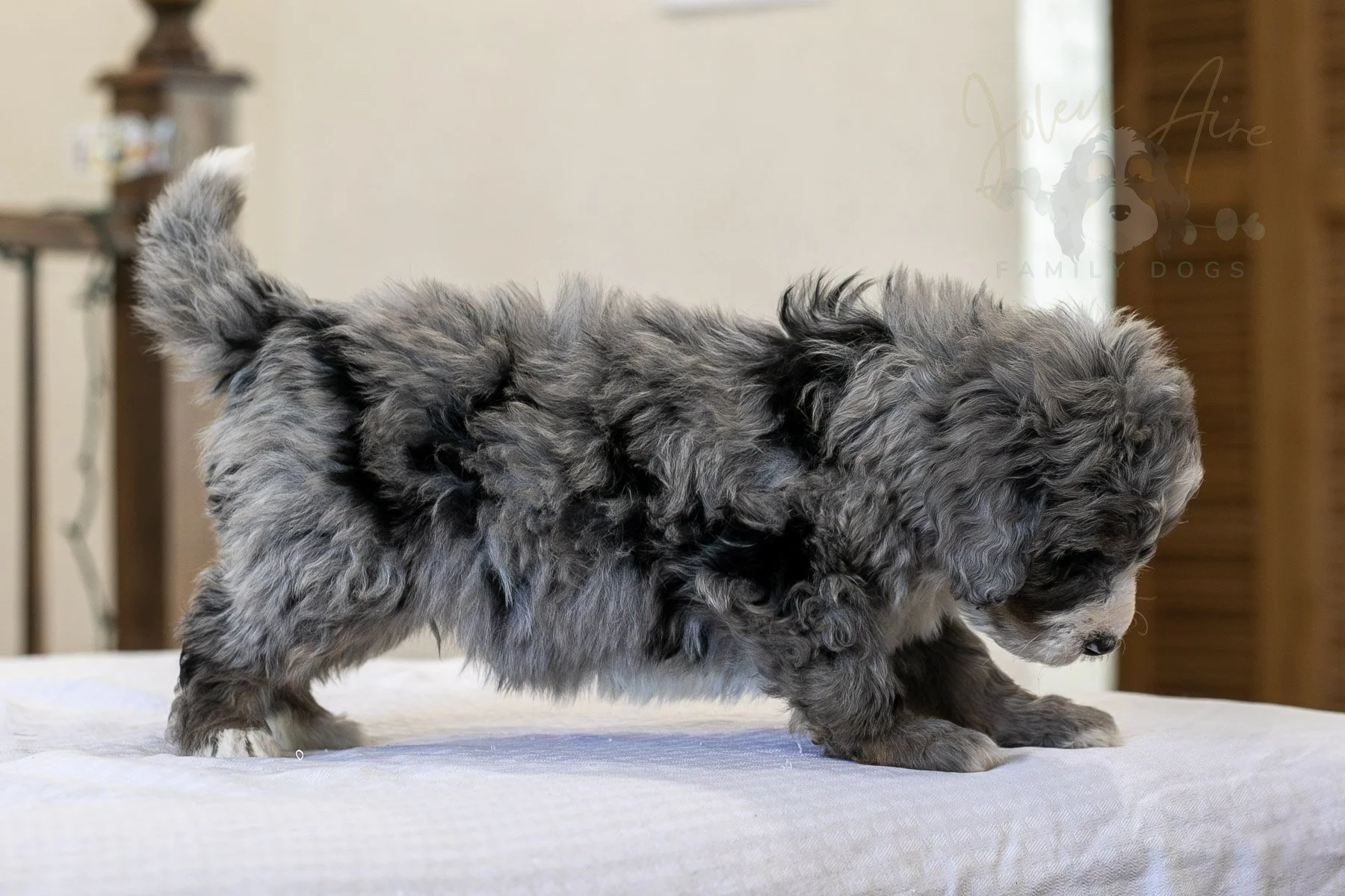 This adorable little boy is Rainier, a tri-color merle male Bernedoodle puppy from Winston and Bonnie. His most charming feature is his stunning merle coat with beautiful patches of black, white, and tan, making him truly one-of-a-kind. Rainier is expected to grow to a loving 60-80 lbs and will surely inherit the gentle, affectionate temperament of his wonderful parents. Raised with care in our Illinois home, Rainier will be ready to join his new family starting January 10, 2026!